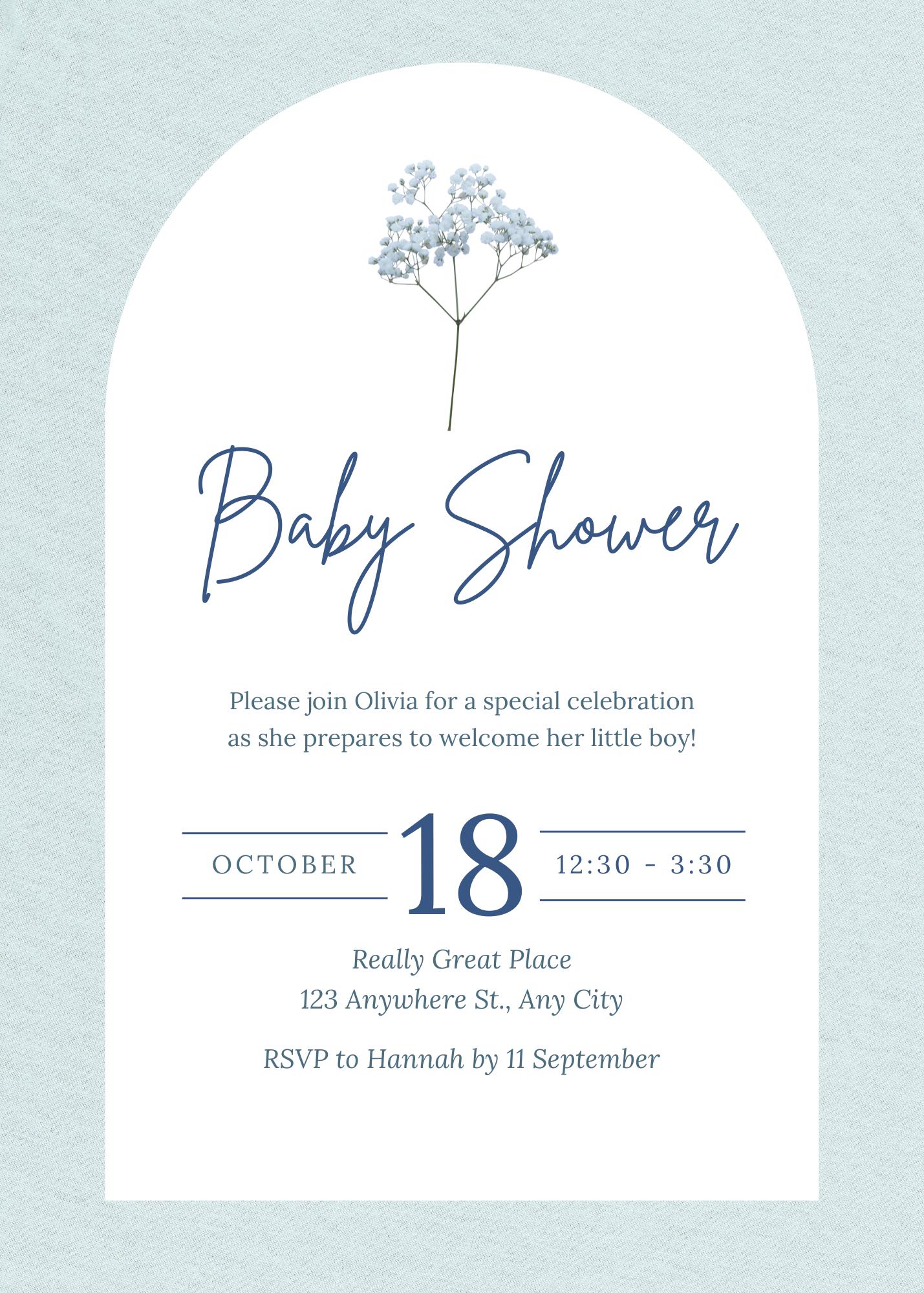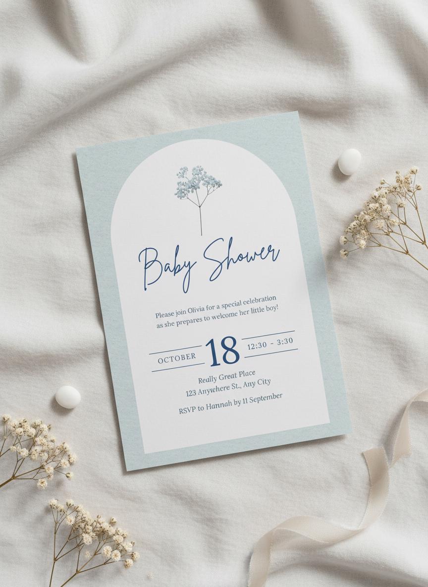 Celebrate a sweet new beginning with this elegant blue baby shower invitation. Featuring a delicate floral illustration and a soft watercolor background, this design is perfect for a classic, modern, or minimalist baby shower theme. The calming blue tones make it especially ideal for welcoming a baby boy, while the timeless layout keeps it versatile and heartfelt.