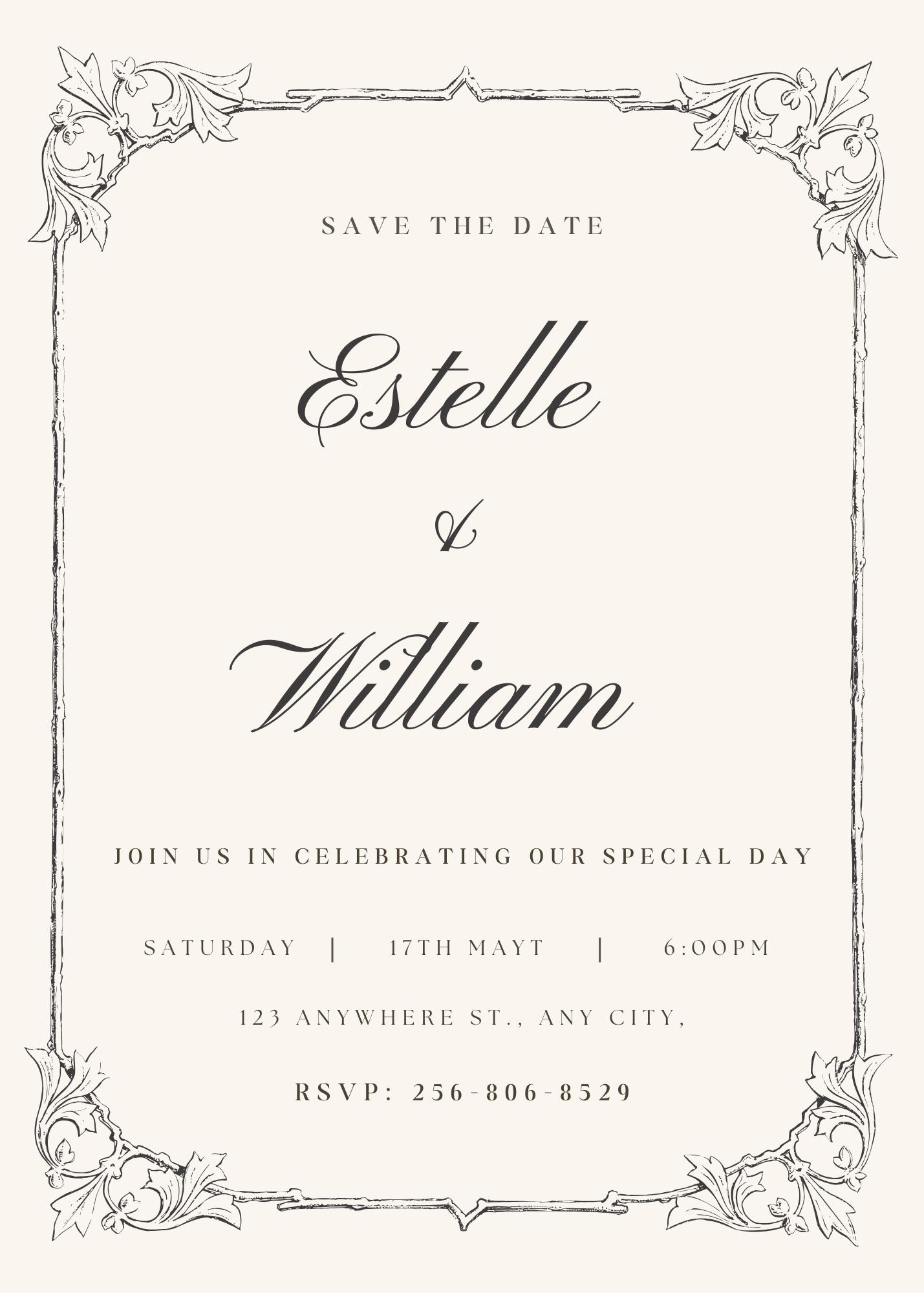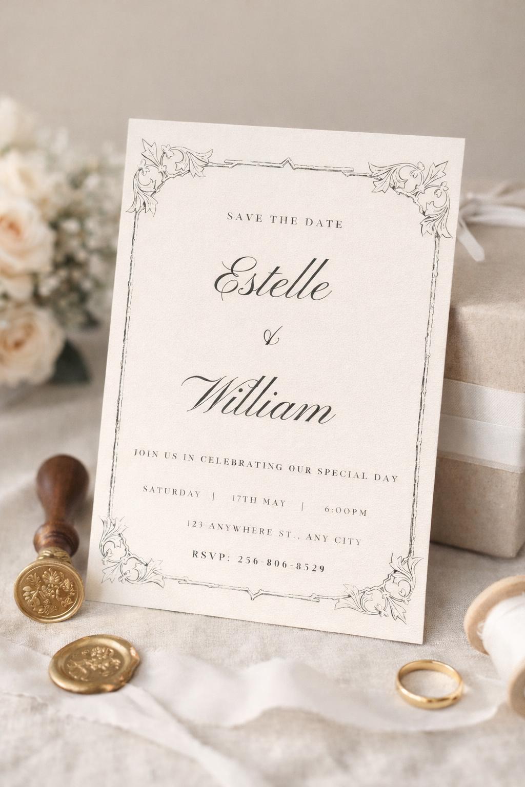 Announce your special day with timeless elegance. This vintage-inspired Save the Date invitation features a soft beige background, delicate floral frame detailing, and refined calligraphy for a romantic, classic look. Perfect for traditional, modern, or minimalist weddings, this design sets the tone for a beautiful celebration.