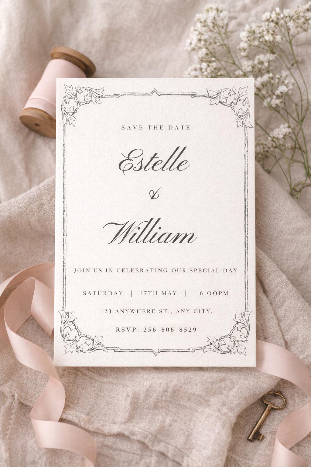 Ideal for printed cards or digital sharing, this invitation offers a graceful and sophisticated way to let your guests know your wedding date in style!